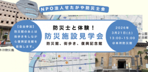 3月21日(土)に防災施設見学会を行います。 墨田区にある本所防災館での防災体験、そのあとは震災・戦災を受けた下町を歩き東京都復興記念館、東京都慰霊度に向かいます。ぜひご参加下さい ■防災施設見学会 本所防災館(都民防災 […]