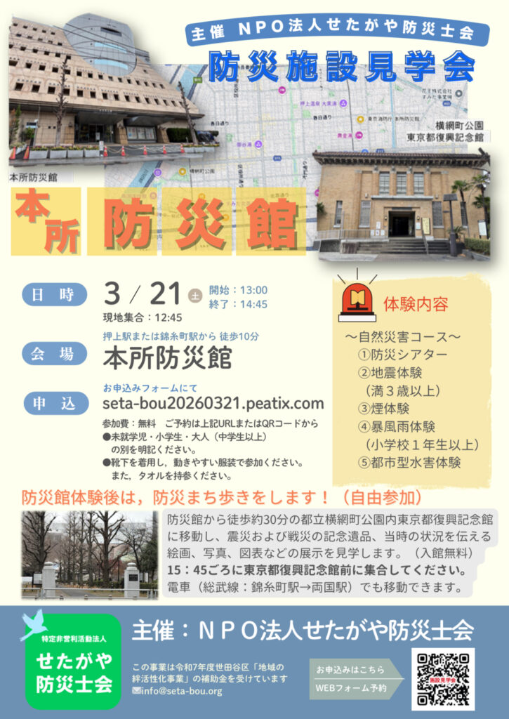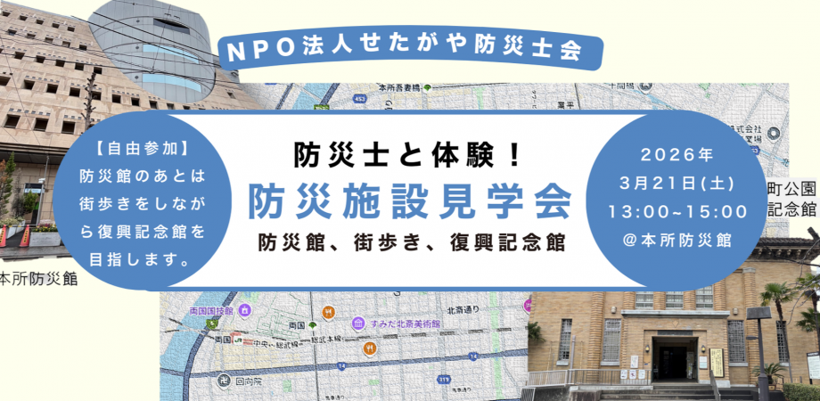 3月21日(土)に防災施設見学会を行います。 墨田区にある本所防災館での防災体験、そのあとは震災・戦災を受けた下町を歩き東京都復興記念館、東京都慰霊度に向かいます。ぜひご参加下さい ■防災施設見学会 本所防災館(都民防災教育センター) 私たちの安全な暮らしのため、楽しみながら地震の揺れの体験、初期消火や応急救護、火災の煙からの避難要領など、防災に関する知識や技術を学べる体験施設です。 今回は私たちせたがや防災士会所属の防災士が皆さんと一緒に身の守り方を体験します。 防災まち歩き 本所界隈は関東大震災で大きな被害を受けた地域の一つです。震災・戦災を超え町がどのように変化していったかを見ながら街を歩きます。 横網公園・東京都復興記念館 記念館では関東大震災・太平洋戦争で東京がどのような被害を受けたか、そしてどのように復興をすすめたかを知ることができます。 また公園内には災禍での犠牲者の遺骨を納めた東京都慰霊堂もあります。 ■日時 2026年3月21日(土)(12:45集合) 第1部 本所防災館【13:00~15:00】 第2部 防災まち歩き 【第1部終了後から約30分】 第3部 横網公園・東京都復興記念館 【16:00~17:00頃】 ※ 第1部の後は自由参加です。街歩きと記念館は希望される方のみご参加ください。 ※ 徒歩移動が難しい方は第2部の街歩きは参加せずバス等で移動し、第3部で再び合流することもできます。 ■募集人数 20人 ■参加費 無料 ■その他 解散後、懇親会を予定しています。 ■主催 特定非営利活動法人せたがや防災士会 ■申込