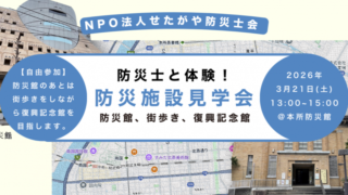 3月21日(土)に防災施設見学会を行います。 墨田区にある本所防災館での防災体験、そのあとは震災・戦災を受けた下町を歩き東京都復興記念館、東京都慰霊度に向かいます。ぜひご参加下さい ■防災施設見学会 本所防災館(都民防災教育センター) 私たちの安全な暮らしのため、楽しみながら地震の揺れの体験、初期消火や応急救護、火災の煙からの避難要領など、防災に関する知識や技術を学べる体験施設です。 今回は私たちせたがや防災士会所属の防災士が皆さんと一緒に身の守り方を体験します。 防災まち歩き 本所界隈は関東大震災で大きな被害を受けた地域の一つです。震災・戦災を超え町がどのように変化していったかを見ながら街を歩きます。 横網公園・東京都復興記念館 記念館では関東大震災・太平洋戦争で東京がどのような被害を受けたか、そしてどのように復興をすすめたかを知ることができます。 また公園内には災禍での犠牲者の遺骨を納めた東京都慰霊堂もあります。 ■日時 2026年3月21日(土)(12:45集合) 第1部 本所防災館【13:00~15:00】 第2部 防災まち歩き 【第1部終了後から約30分】 第3部 横網公園・東京都復興記念館 【16:00~17:00頃】 ※ 第1部の後は自由参加です。街歩きと記念館は希望される方のみご参加ください。 ※ 徒歩移動が難しい方は第2部の街歩きは参加せずバス等で移動し、第3部で再び合流することもできます。 ■募集人数 20人 ■参加費 無料 ■その他 解散後、懇親会を予定しています。 ■主催 特定非営利活動法人せたがや防災士会 ■申込
