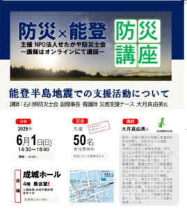 【開催しました】講演「能登半島地震での支援活動について」2025年6月1日 第一部の総会に引き続き、第二部では、石川県防災士会の大月副理事長を講師にお迎えし、「能登半島地震での支援活動について」と題した講演会を開催しまし […]